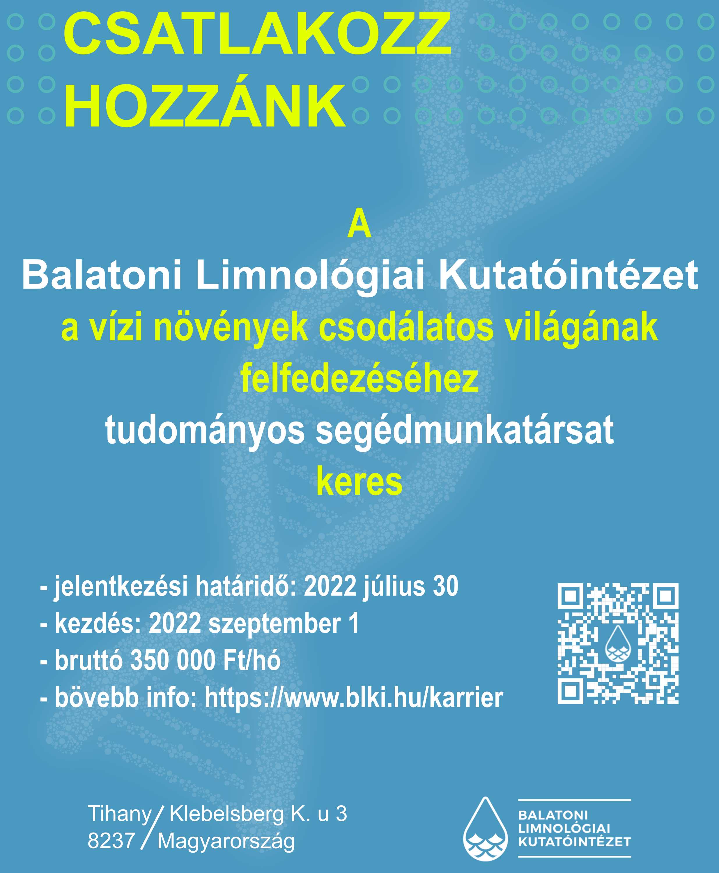 Ha biológus vagy és érdekelnek a vízi növények, szívesen dolgoznál terepen és laboratóriumban, vannak önálló kutatási ötleteid és szívesen erősítenéd a Balatoni Limnológiai Kutatóintézet hazai és nemzetközi tudományos szerepét, akkor Téged várunk!